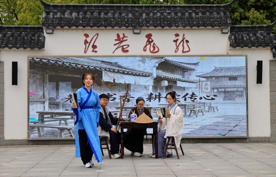 签约仪式后,由华东师范大学学生自编自演的情景剧《巷韵书香·耕读传心》精彩上演。该剧以顾野王“读书堆”文脉为起点,串联起乾隆皇帝南巡赐名“新巷头”的传说,以及新巷村世代相传的耕读故事。舞台上,一位白发村老端着粗陶茶碗,娓娓道来“新巷头”的由来;头戴竹笠的耕者手捧书卷,念出“百世垂芳在一经,茂林修竹读书声”;远道而来的学子拱手行礼,立志“把先贤的文脉一直传下去”。