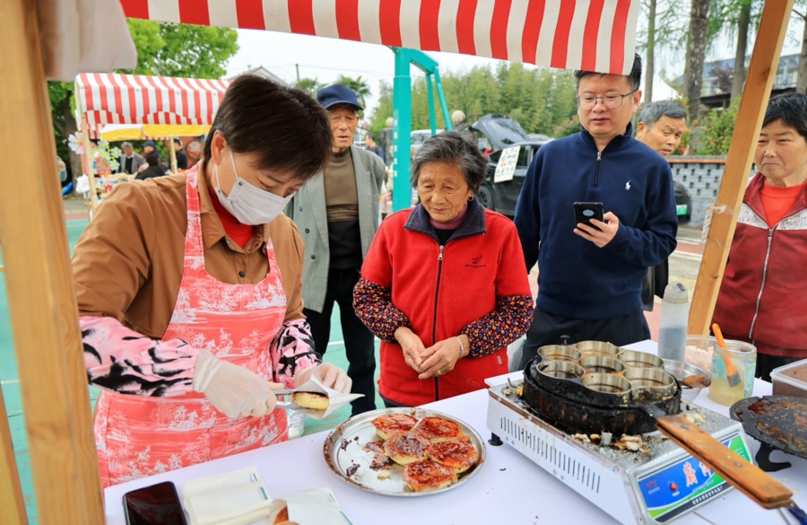 一旁的“巷趣寻字”汉字寻宝游戏更是人气爆棚,小游客们拿着汉字卡片,在口袋公园的花丛边、凉亭里四处寻找配对汉字,拼出“耕读传家”“龙飞巷头”等主题词。“以书换苗”旧书漂流活动前,村民们拎着一摞摞闲置正版书籍,排队换取果树苗、花苗。“巷里烟火”小集市汇聚了30个文创手作、非遗好物、本土农产品摊位,土鸡蛋、手工酱菜、草编工艺品琳琅满目,村民们边逛边尝,烟火气与书卷气奇妙地融合在一起。