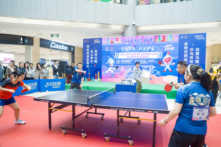4月18日下午,2026上海乒乓球嘉年华暨“国韵双喜杯”乒乓球混合团体赛(金山区选拔赛)在百联金山购物中心火热开赛。与以往不同,这次比赛的“赛场”搬进了商圈中庭,市民逛街之余就能近距离围观甚至上场体验。本次赛事以“全民乒乓·乒出精彩”为主题,融合了群众体育、商圈活力、非遗手作、特色美食、农特产品和文旅体验,真正让乒乓球走进生活。